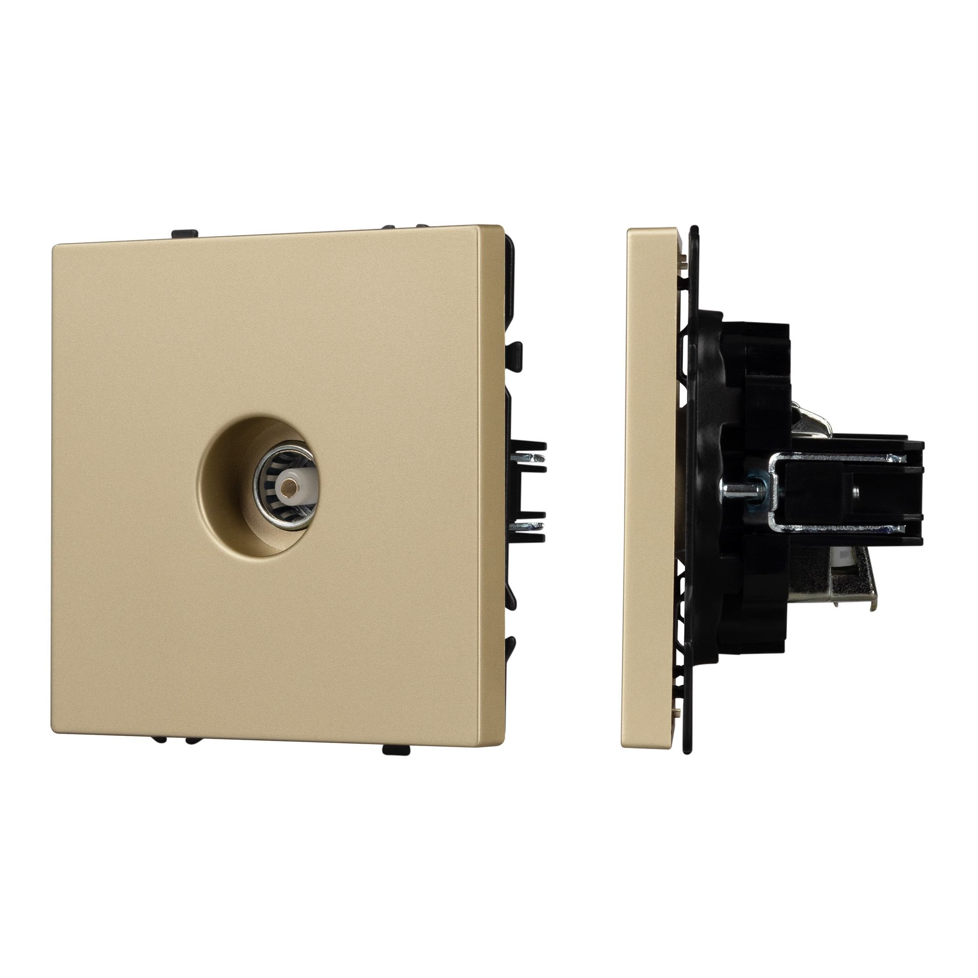Строгие геометрические линии гармонично сочетаются с функциональностью продуманных механизмов, создавая идеальное решение для дизайн-проектов, где важны как эстетика, так и практичность. Механизм ТВ-розетки совместим с рамками серии NOBE, создает утонченный минималистичный вид. Скрытый тип монтажа позволяет гармонично встроить в интерьер любого современного дизайн-проекта. Видимая часть выполнена из высококачественного пластика цвета золотой песок и имеет Soft-Touch покрытие, что придает изделию приятные тактильные ощущения и стильный внешний вид. Механизм ТВ-розетки предназначена для подключения кабельного телевидения, путем подсоединения коаксиального кабеля к винтовому зажиму. Усиленные распорные лапки двойного захвата надежно фиксируют устройство в установочном подрозетнике круглого сечения диаметром 60мм. Суппорт окрашен в черный матовый цвет и выполнен из металла толщиной 1,5мм, что обеспечивает безопасность и уверенность в установке. На каждой стороне суппорта размещены фиксирующие элементы, позволяющие комбинировать механизмы в системы до 5шт как горизонтально, так и вертикально.