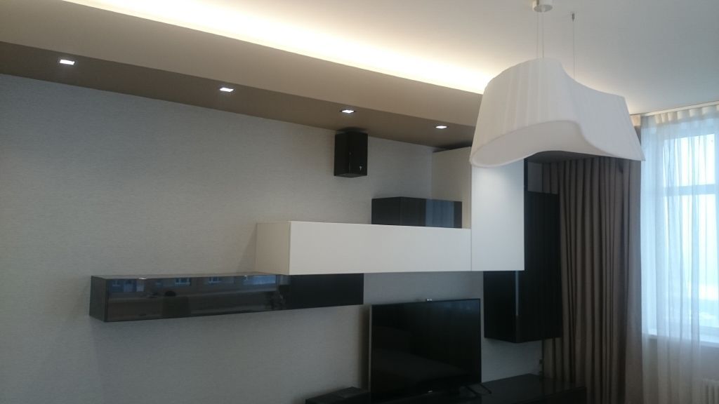 Во всей квартире была установлена светодиодная подсветка потолков. Из гипсокартона был создан второй уровень потолка, в новый уровень были вмонтированы точечные встраиваемые светодиодные светильники, а в образовавшейся нише между двумя уровнями потолка была установлена светодиодная лента Arlight дневного белого свечения.