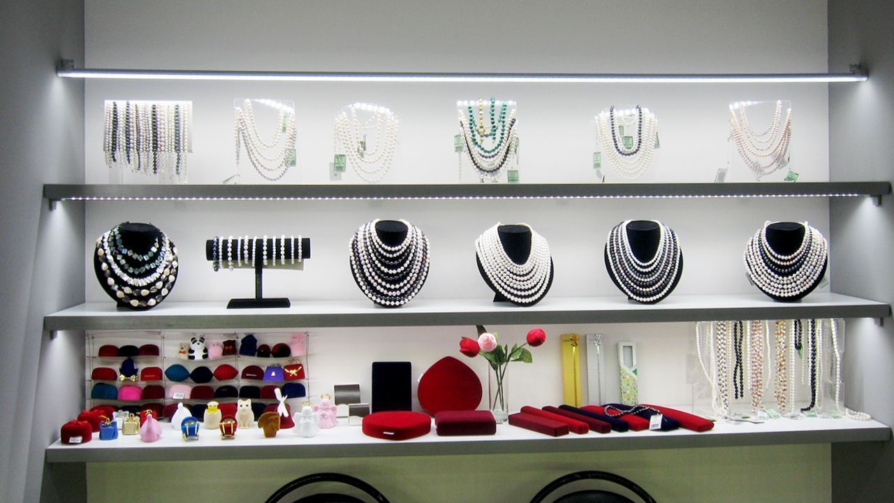 А самое интересное - подсветка витрин, для этого использованы алюминиевые светодиодные профили. Подсветка нижних уровней была реализована при помощи врезных профилей, которые вмонтированы в нижнюю сторону полок. Подсветка верхнего уровня, над которым полок нет, выполнена с использованием круглого профиля, держатели которого позволяют регулировать направление свечения. В качестве источника света в профилях используется светодиодная лента Arlight чистого белого цвета свечения, который отлично подходит для освещения ювелирной продукции.