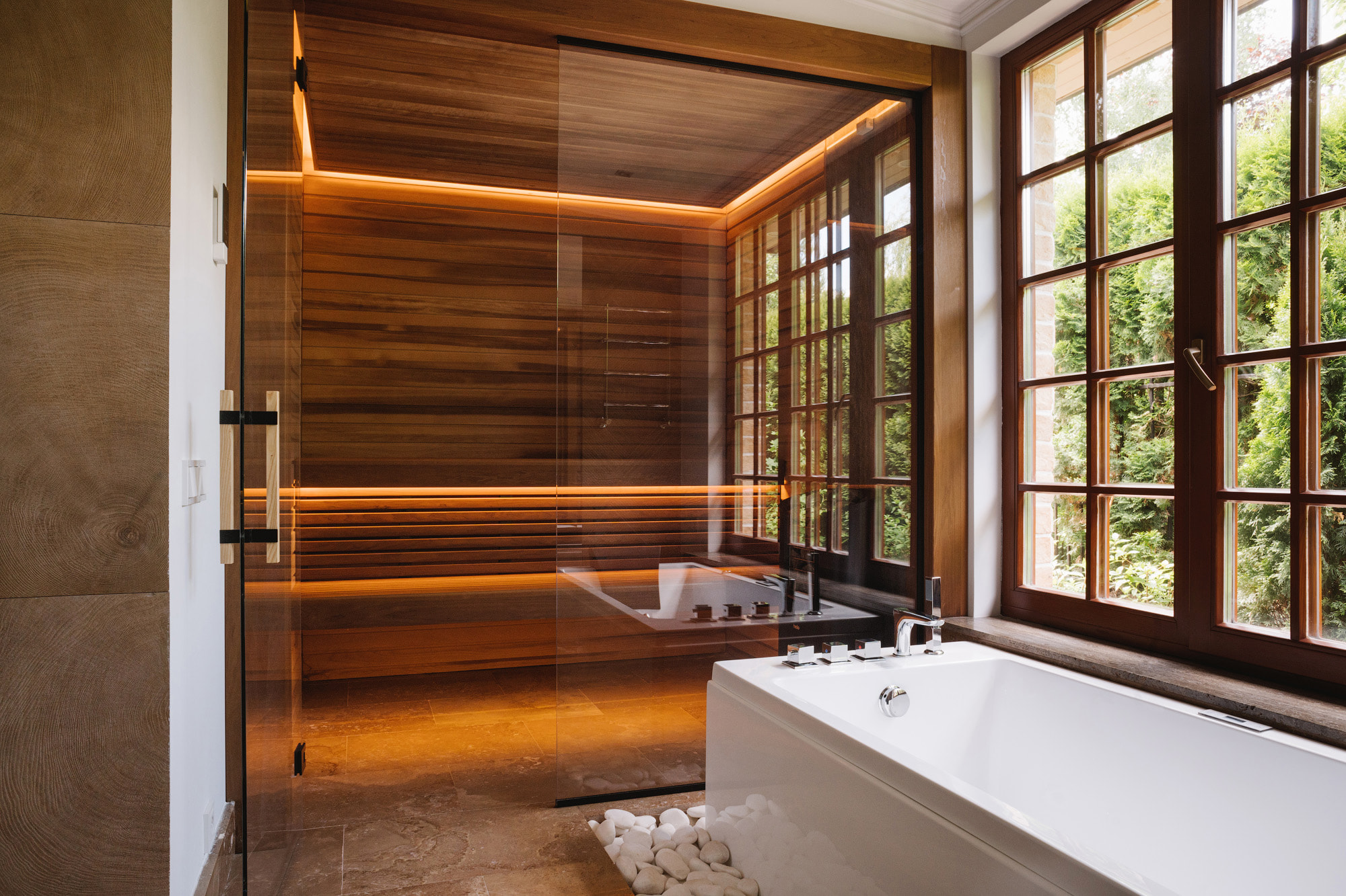 Уютная сауна отделена от ванной комнаты прозрачной стеклянной перегородкой, что визуально делает компактное пространство шире. Полки и отделка стен внутри парной выполнены из термоосины, которая отталкивает влагу и обладает низкой теплопроводностью.
