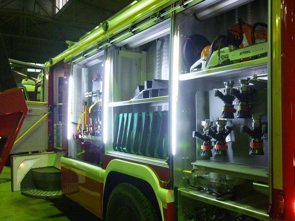 Для демонстрации пожарного автомобиля на выставке спецтехники была установлена светодиодная подсветка его отсеков.