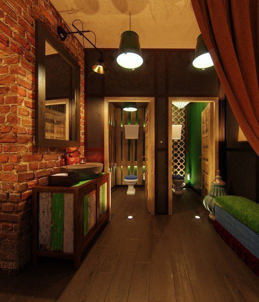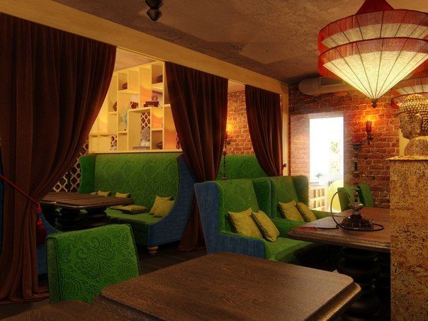В данном ресторане была установлена декоративная и акцентная подсветка полок и других деталей интерьера.