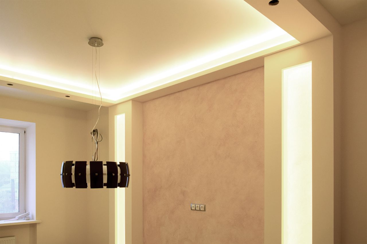 Дополнительное светодиодное освещение в многоуровневом потолке из гипсокартона. Зонирование помещения вертикальными линиями света.
